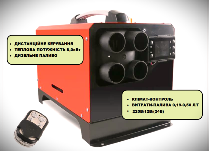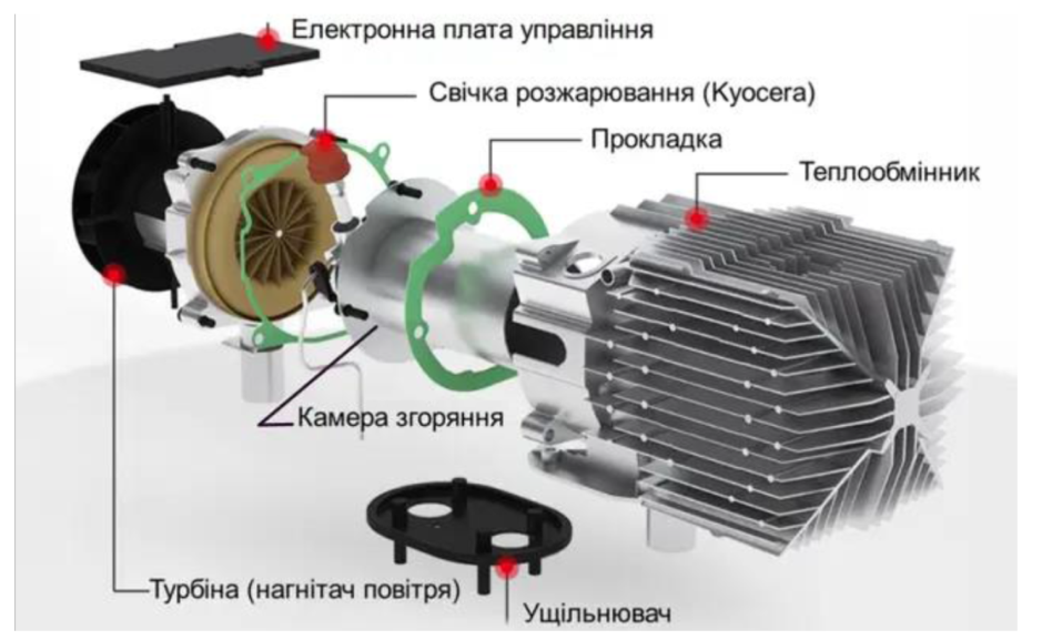 Теплообмінник нагрівається за рахунок згоряння дизельної суміші в спеціальній камері, що гарантує стабільну роботу пристрою навіть у складних умовах.