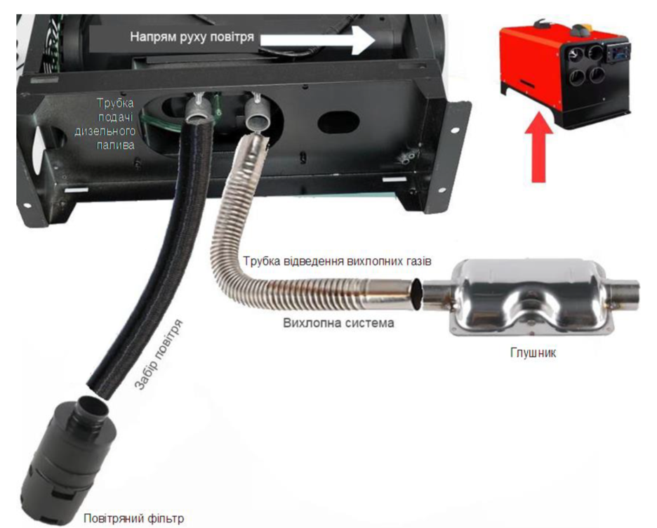 - Впускна труба з фільтром — транспортує повітря до теплообмінника для подальшого нагріву.