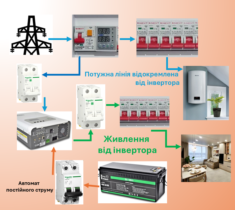 Потужні споживачі (Вимикаємо): Електроплити, бойлери, електрочайники та теплі підлоги зазвичай від'єднуються від лінії інвертора, щоб уникнути перевантаження системи.